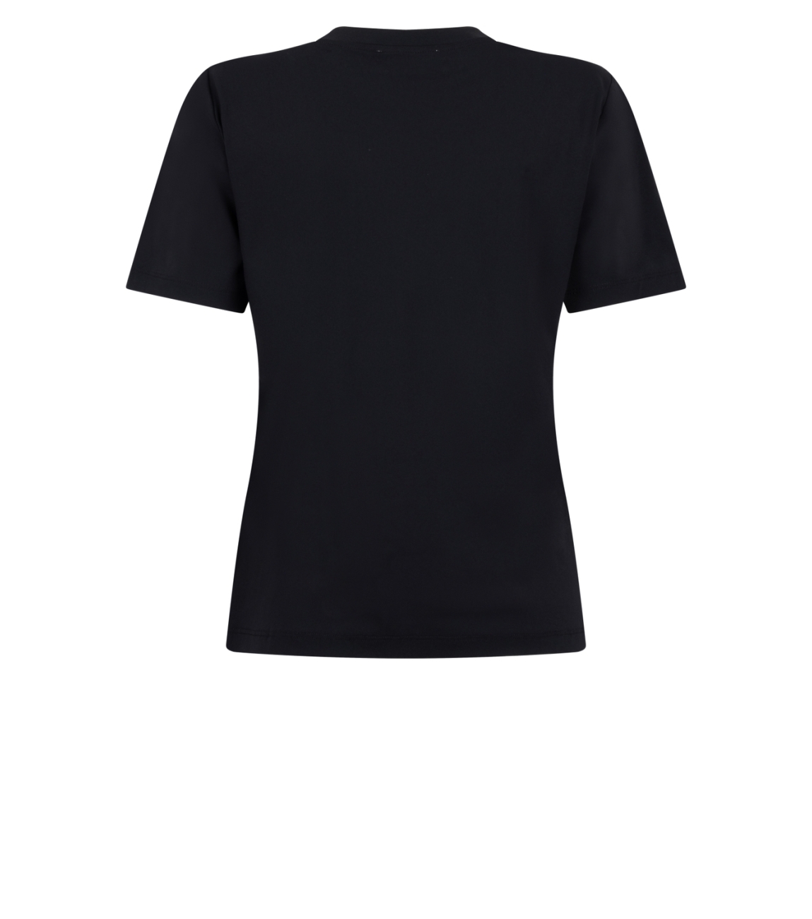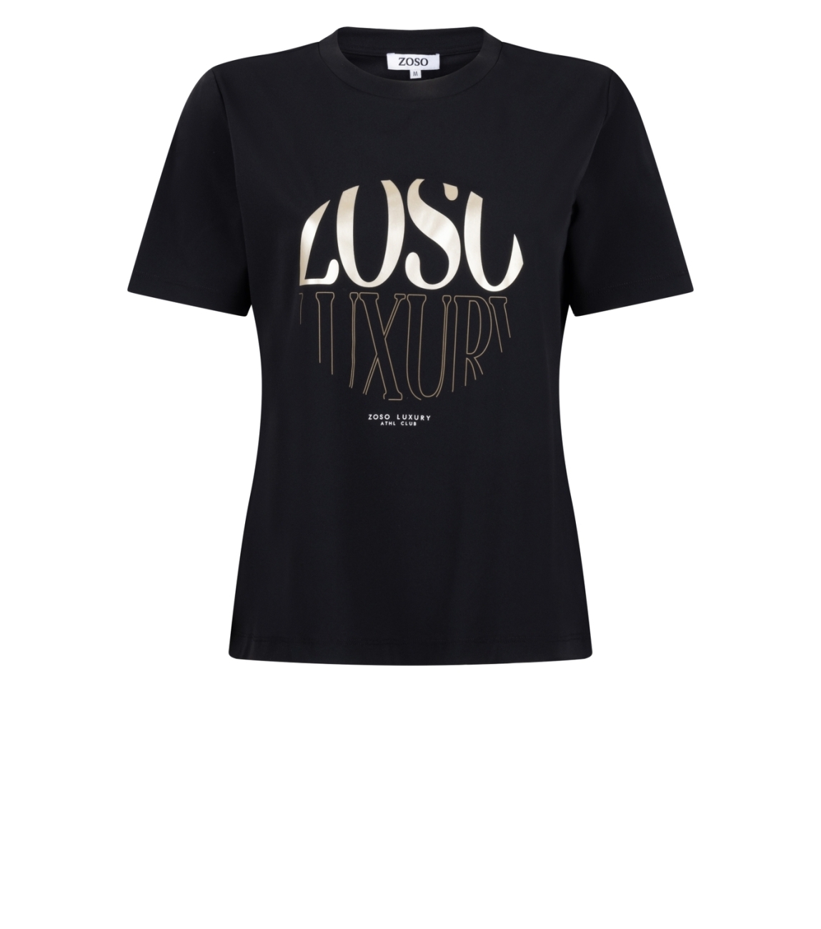 Zoso T-shirt Selma. Dit rechtvallend model is voorzien van een ronde hals en heeft korte mouwen. Dit zwarte T-shirt van Zoso is aan de voorzijde bewerkt met een goudkleurig tekstopdruk.