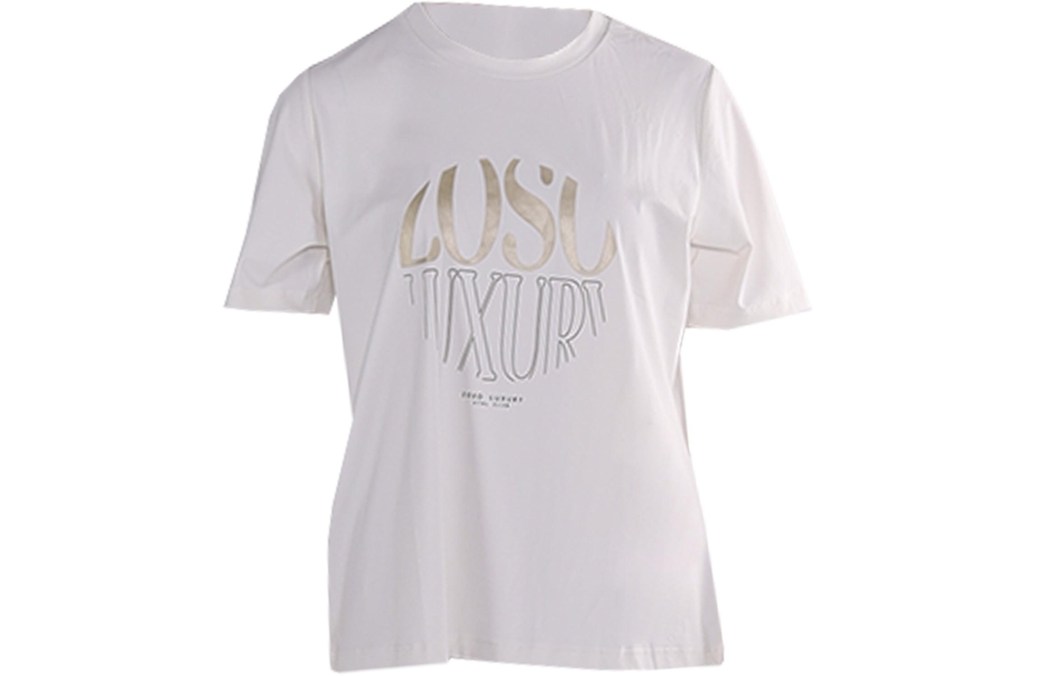 Zoso T-shirt Selma. Dit rechtvallend model is voorzien van een ronde hals en heeft korte mouwen. Dit witte T-shirt van Zoso is aan de voorzijde bewerkt met een goudkleurig tekstopdruk.