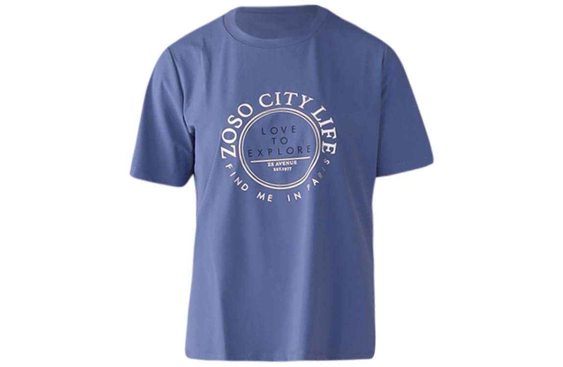 Zoso T-shirt Selma. Dit rechtvallend model is voorzien van een ronde hals en heeft korte mouwen. Dit blauwe T-shirt van Zoso is aan de voorzijde bewerkt met een opdruk in de kleuren goud, zilver en wit.