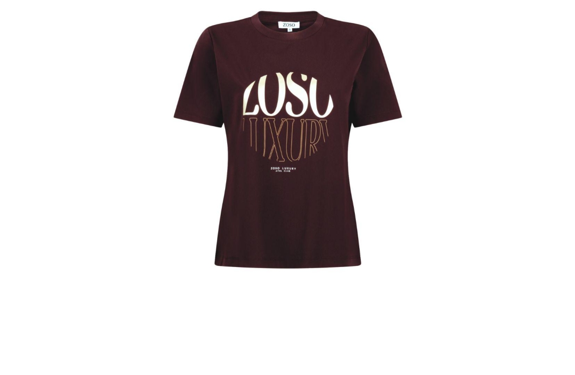 Zoso T-shirt Selma. Dit rechtvallend model is voorzien van een ronde hals en heeft korte mouwen. Dit bordeauxkleurige T-shirt van Zoso is aan de voorzijde bewerkt met een goudkleurig tekstopdruk.