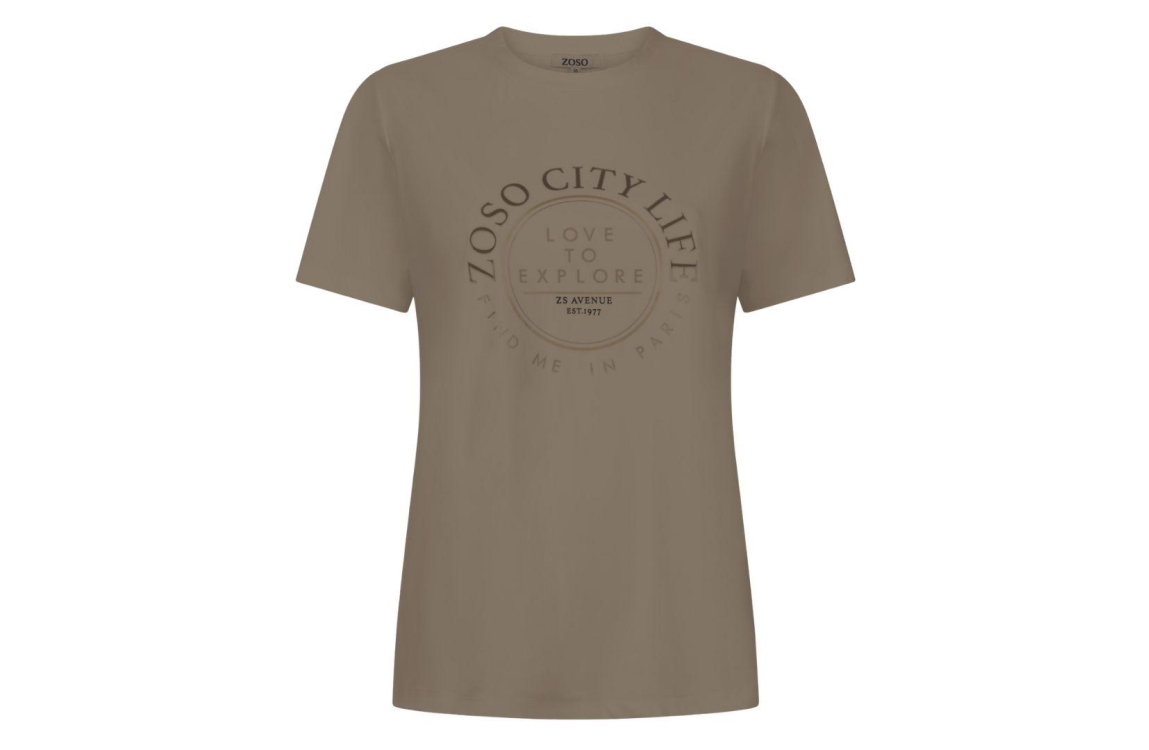 Zoso T-shirt Selma. Dit rechtvallend model is voorzien van een ronde hals en heeft korte mouwen. Dit bruine T-shirt van Zoso is aan de voorzijde bewerkt met een opdruk in de kleurem goud, zilver en wit.