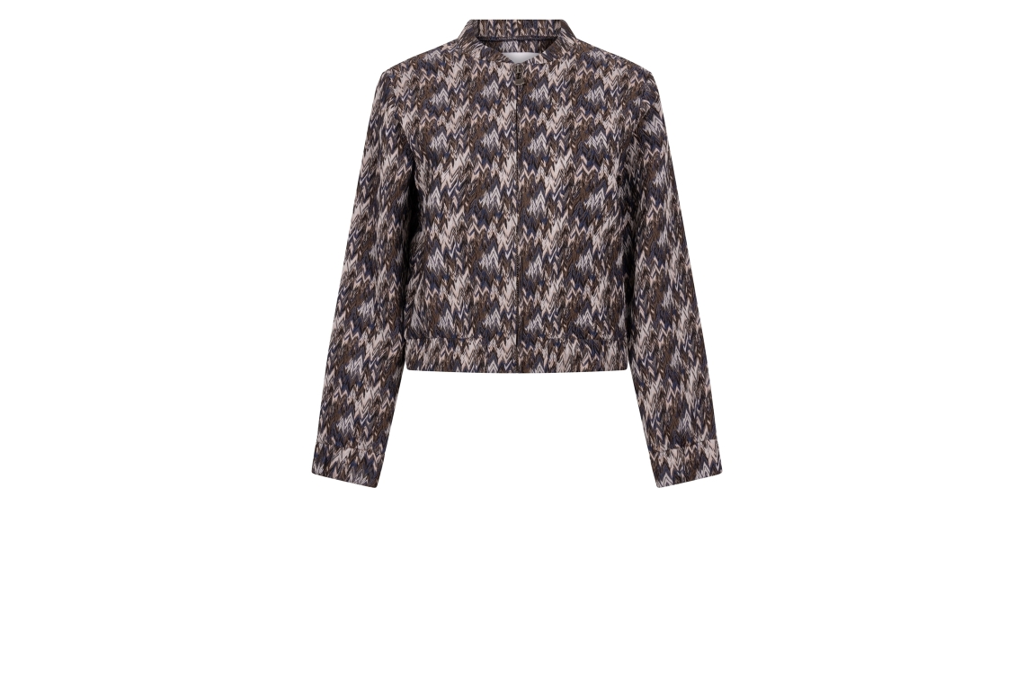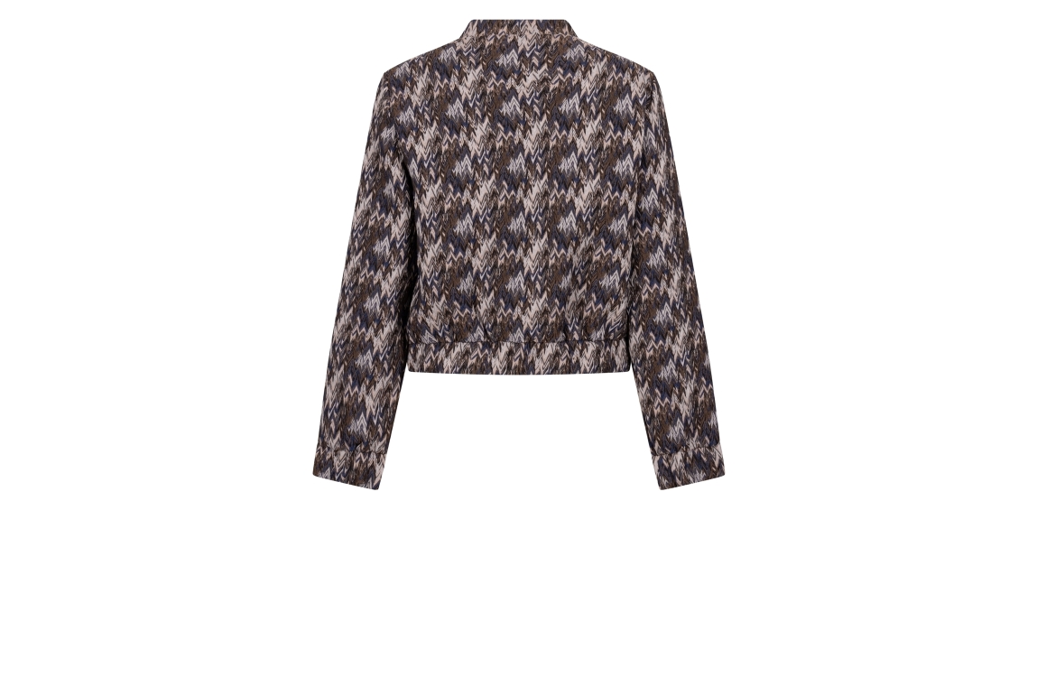 Zoso jasje Sonja. Dit wijdvallend model is voorzien van een ronde hals en heeft lange mouwen. Dit blauw/bruine jasje van Zoso sluit door middel van een rits en beschikt over twee steekzakken. Dit model is bewerkt met een zigzag print.