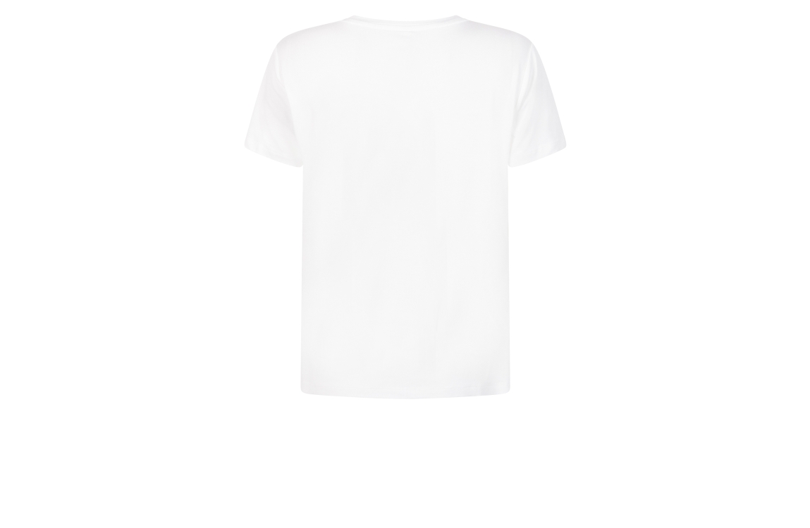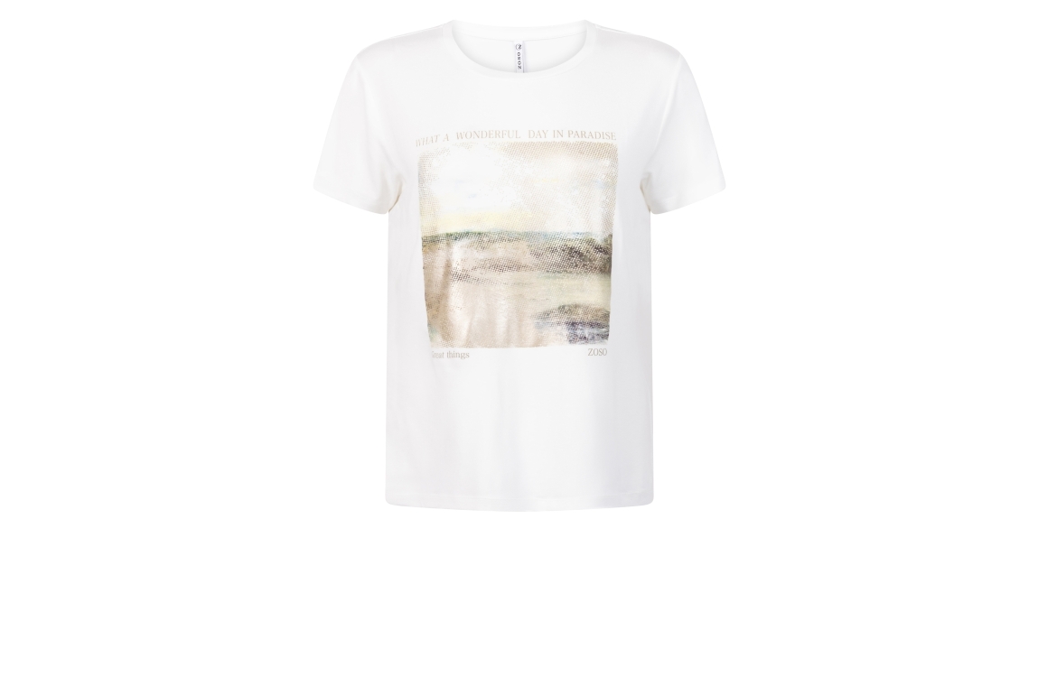 Zoso T-shirt valerie. Dit rechtvallend model is voorzien van een ronde hals en heeft korte mouwen. Deze witte T-shirt van Zoso is aan de voorzijde bewerkt met een beige/goud kleurige opdruk.