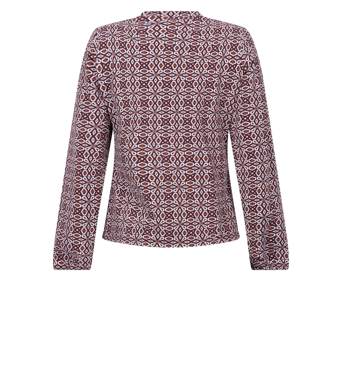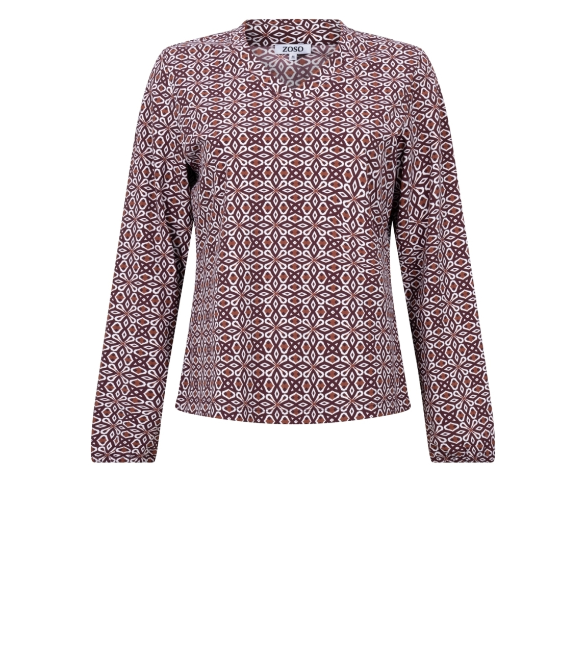 Zoso shirt Vanessa. Dit rechtvallend model is voorzien van een v-hals en heeft lange mouwen. Deze witte/bordeaux kleurige shirt van Zoso is all-over bewerkt met een grafische print.